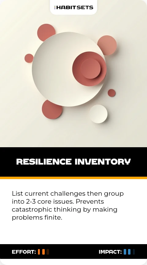 List current challenges then group into 2-3 core issues. Prevents catastrophic thinking by making problems finite.