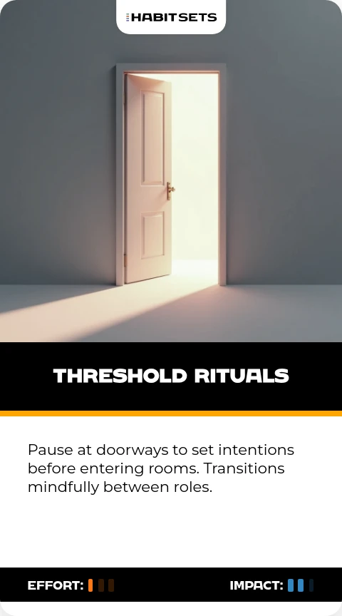 Pause at doorways to set intentions before entering rooms. Transitions mindfully between roles.
