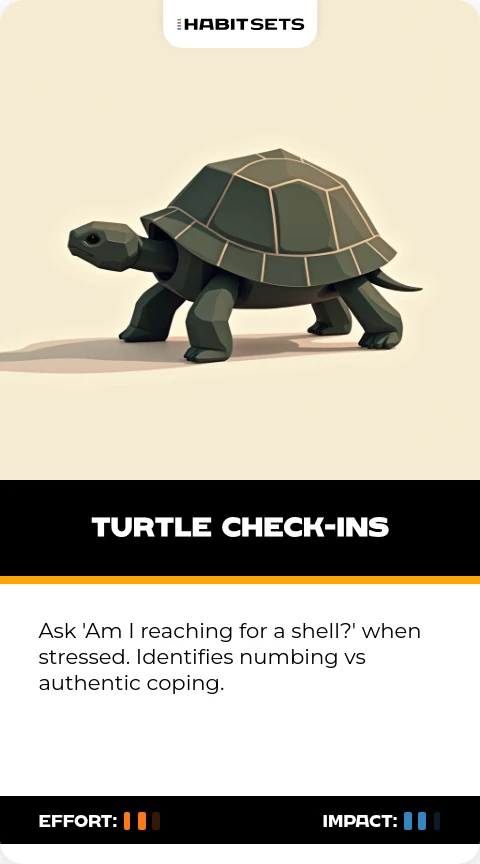 Ask 'Am I reaching for a shell?' when stressed. Identifies numbing vs authentic coping.