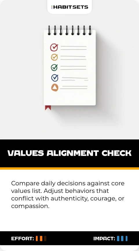 Compare daily decisions against core values list. Adjust behaviors that conflict with authenticity, courage, or compassion.
