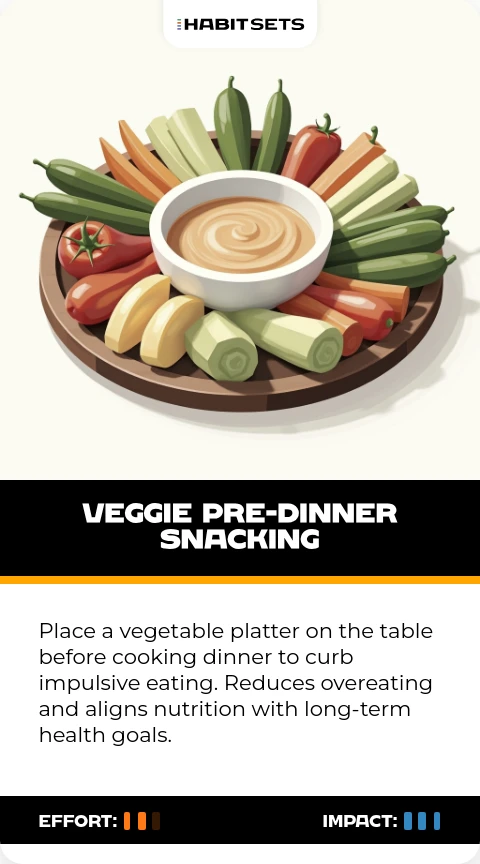 Place a vegetable platter on the table before cooking dinner to curb impulsive eating. Reduces overeating and aligns nutrition with long-term health goals.