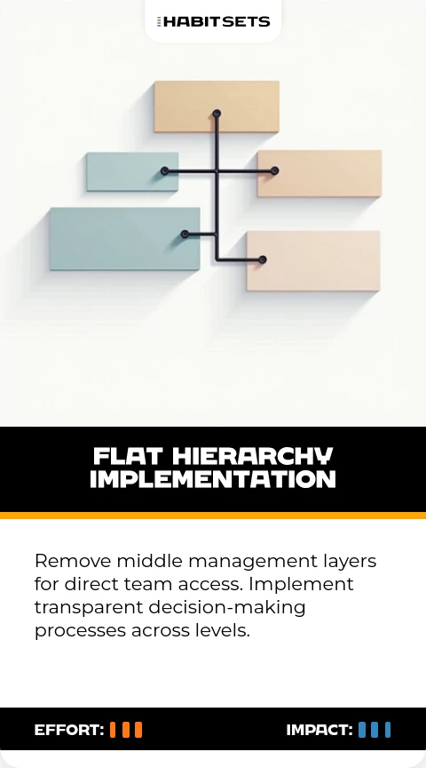 Remove middle management layers for direct team access. Implement transparent decision-making processes across levels.