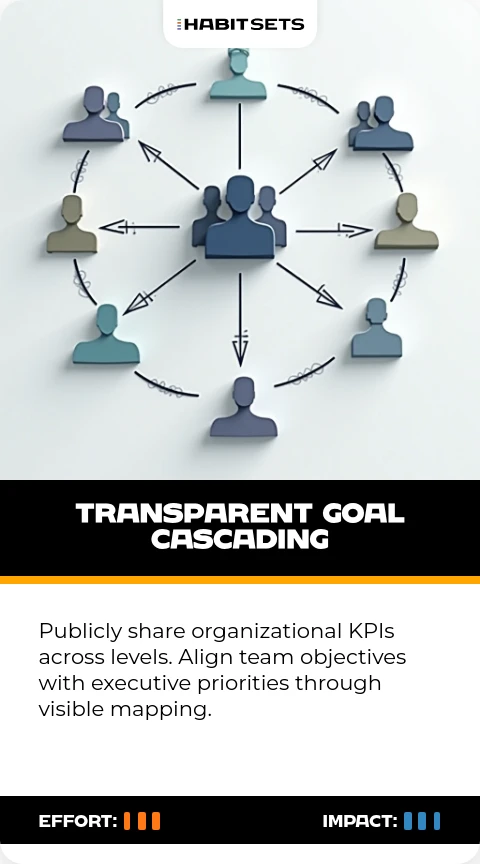 Publicly share organizational KPIs across levels. Align team objectives with executive priorities through visible mapping.