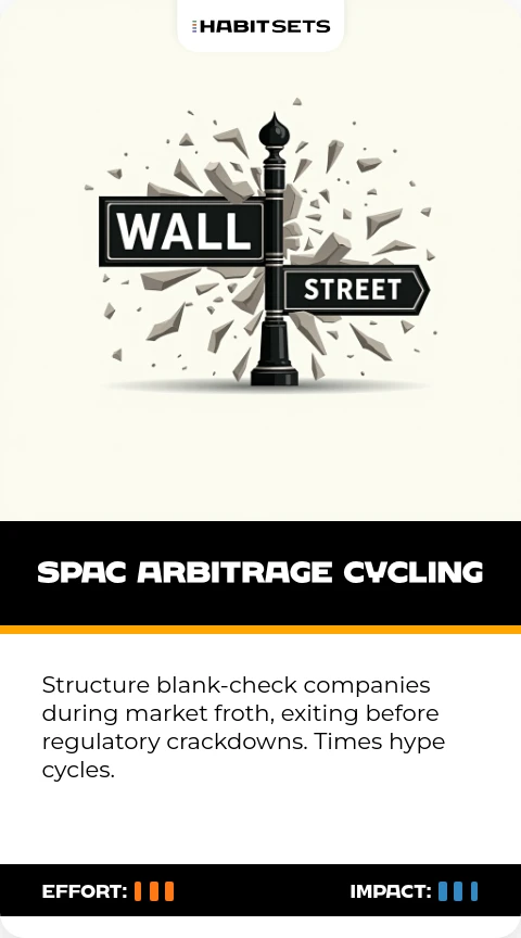 Structure blank-check companies during market froth, exiting before regulatory crackdowns. Times hype cycles.