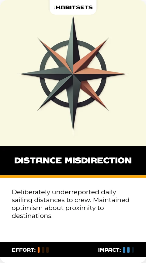 Deliberately underreported daily sailing distances to crew. Maintained optimism about proximity to destinations.