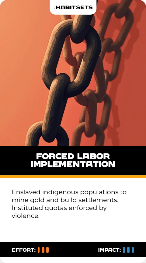 Enslaved indigenous populations to mine gold and build settlements. Instituted quotas enforced by violence.