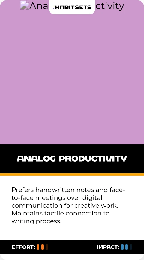 Prefers handwritten notes and face-to-face meetings over digital communication for creative work. Maintains tactile connection to writing process.