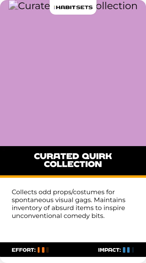 Collects odd props/costumes for spontaneous visual gags. Maintains inventory of absurd items to inspire unconventional comedy bits.