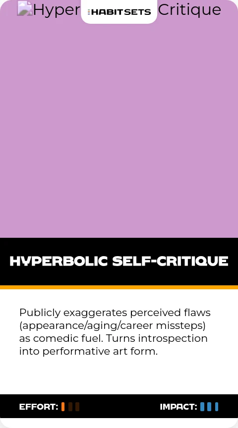 Publicly exaggerates perceived flaws (appearance/aging/career missteps) as comedic fuel. Turns introspection into performative art form.