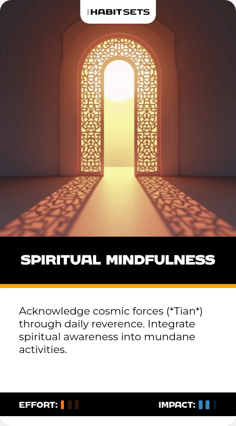 Acknowledge cosmic forces (*Tian*) through daily reverence. Integrate spiritual awareness into mundane activities.