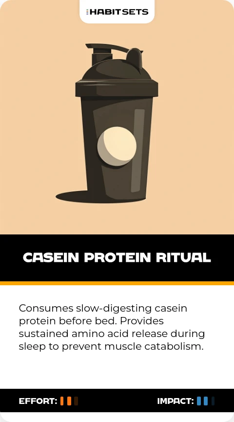 Consumes slow-digesting casein protein before bed. Provides sustained amino acid release during sleep to prevent muscle catabolism.