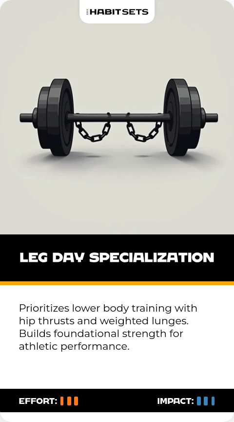 Prioritizes lower body training with hip thrusts and weighted lunges. Builds foundational strength for athletic performance.