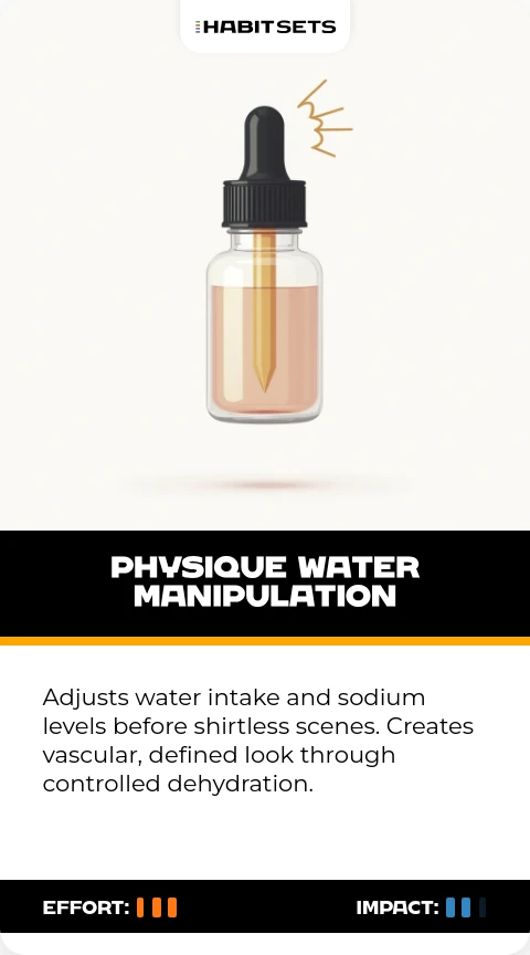 Adjusts water intake and sodium levels before shirtless scenes. Creates vascular, defined look through controlled dehydration.