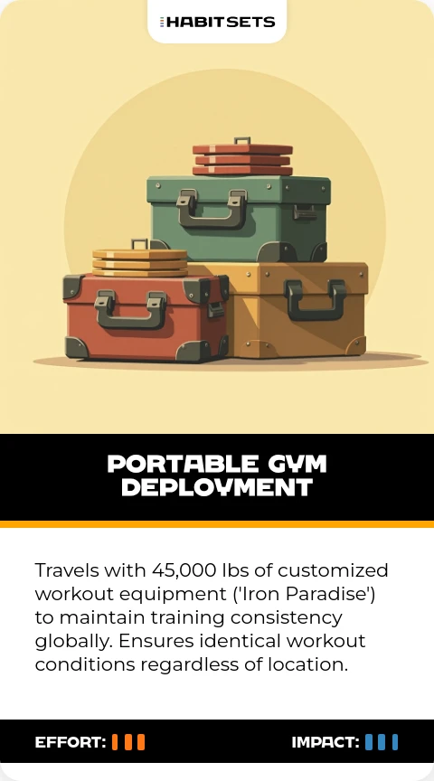 Travels with 45,000 lbs of customized workout equipment ('Iron Paradise') to maintain training consistency globally. Ensures identical workout conditions regardless of location.