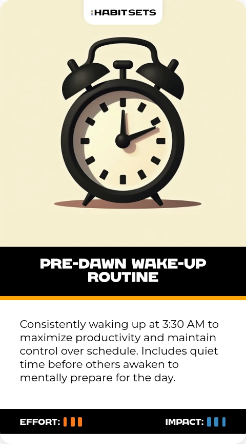 Consistently waking up at 3:30 AM to maximize productivity and maintain control over schedule. Includes quiet time before others awaken to mentally prepare for the day.