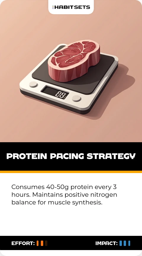 Consumes 40-50g protein every 3 hours. Maintains positive nitrogen balance for muscle synthesis.