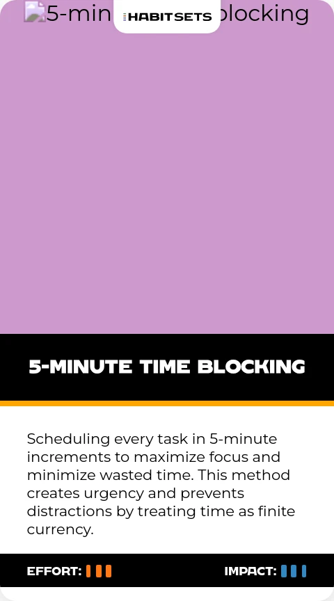 Scheduling every task in 5-minute increments to maximize focus and minimize wasted time. This method creates urgency and prevents distractions by treating time as finite currency.