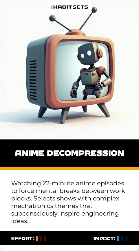 Watching 22-minute anime episodes to force mental breaks between work blocks. Selects shows with complex mechatronics themes that subconsciously inspire engineering ideas.