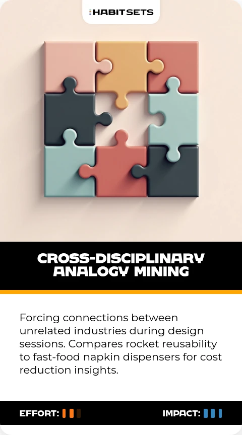 Forcing connections between unrelated industries during design sessions. Compares rocket reusability to fast-food napkin dispensers for cost reduction insights.