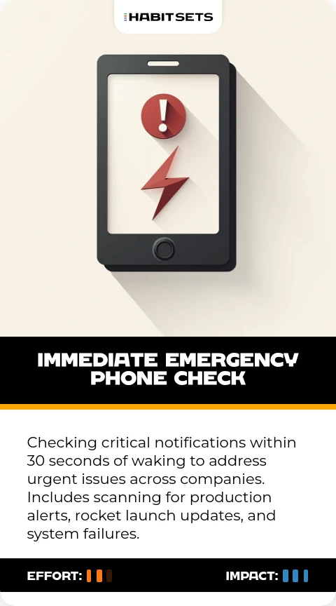 Checking critical notifications within 30 seconds of waking to address urgent issues across companies. Includes scanning for production alerts, rocket launch updates, and system failures.