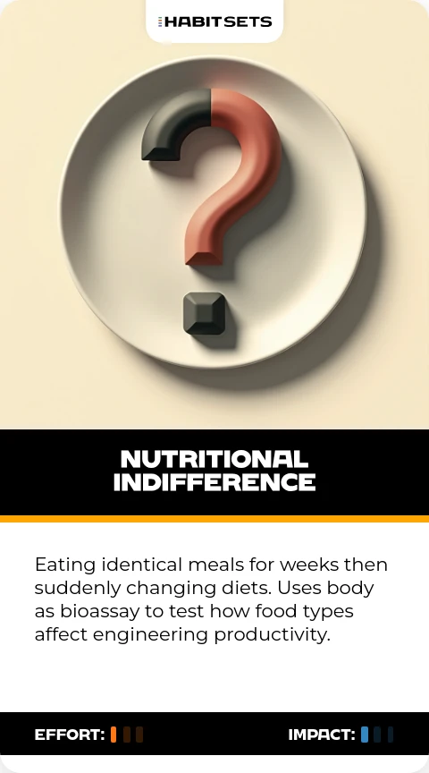 Eating identical meals for weeks then suddenly changing diets. Uses body as bioassay to test how food types affect engineering productivity.