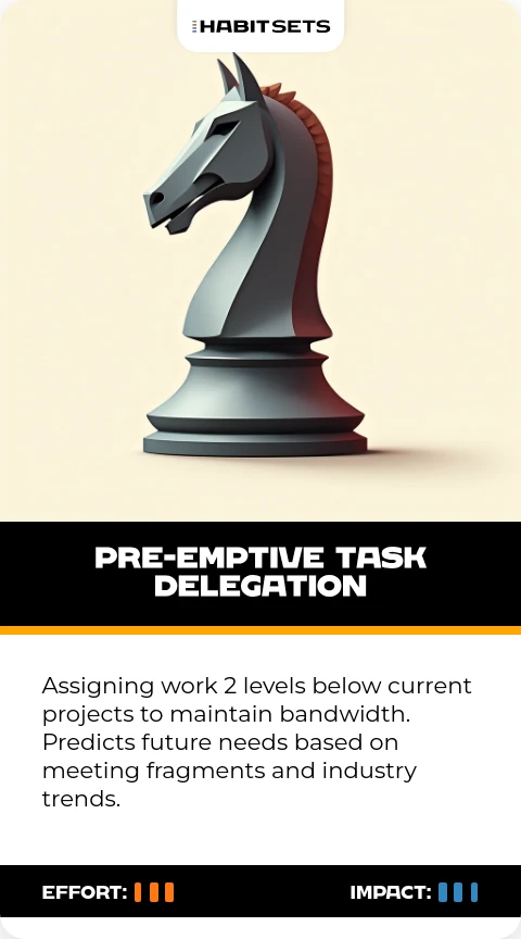Assigning work 2 levels below current projects to maintain bandwidth. Predicts future needs based on meeting fragments and industry trends.