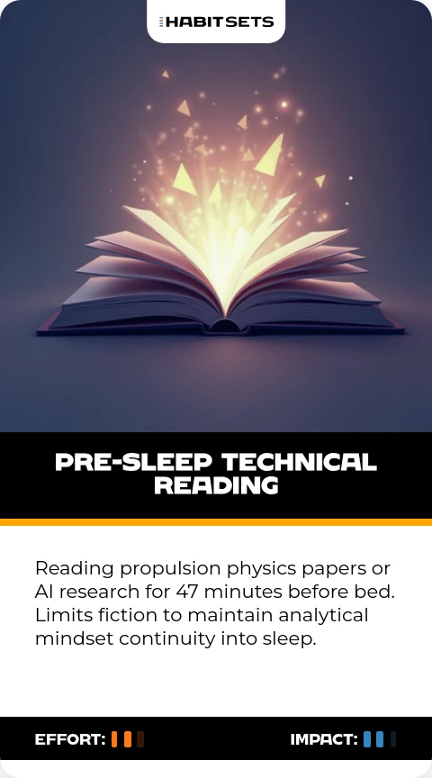 Reading propulsion physics papers or AI research for 47 minutes before bed. Limits fiction to maintain analytical mindset continuity into sleep.