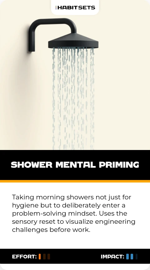 Taking morning showers not just for hygiene but to deliberately enter a problem-solving mindset. Uses the sensory reset to visualize engineering challenges before work.