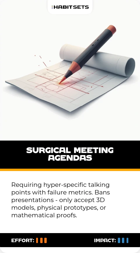 Requiring hyper-specific talking points with failure metrics. Bans presentations - only accept 3D models, physical prototypes, or mathematical proofs.