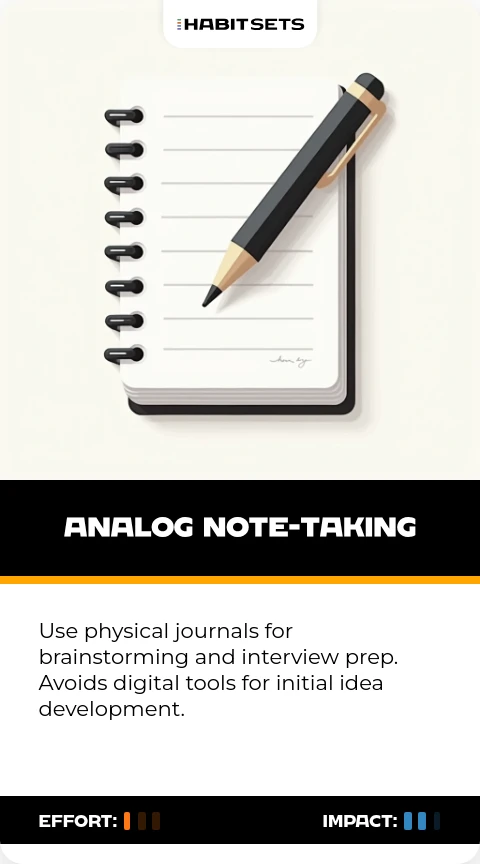 Use physical journals for brainstorming and interview prep. Avoids digital tools for initial idea development.