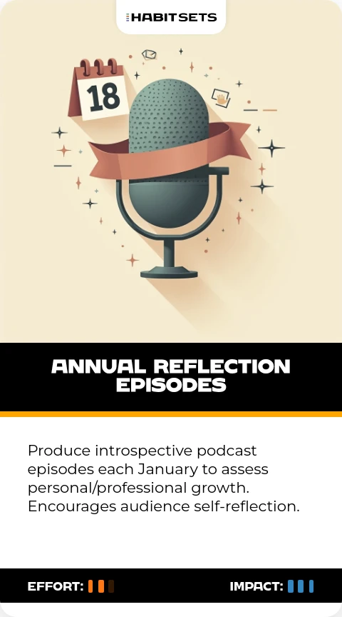 Produce introspective podcast episodes each January to assess personal/professional growth. Encourages audience self-reflection.