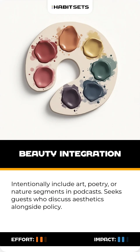 Intentionally include art, poetry, or nature segments in podcasts. Seeks guests who discuss aesthetics alongside policy.