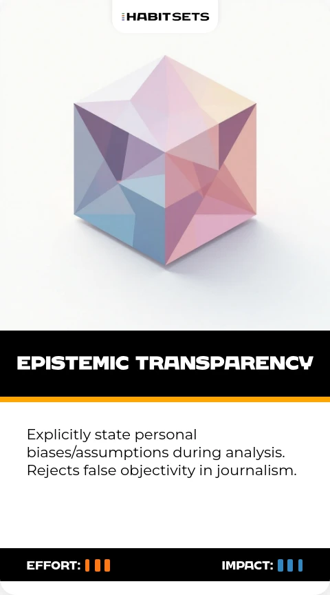 Explicitly state personal biases/assumptions during analysis. Rejects false objectivity in journalism.