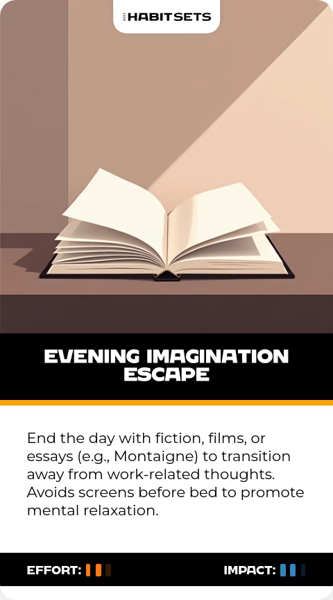 End the day with fiction, films, or essays (e.g., Montaigne) to transition away from work-related thoughts. Avoids screens before bed to promote mental relaxation.