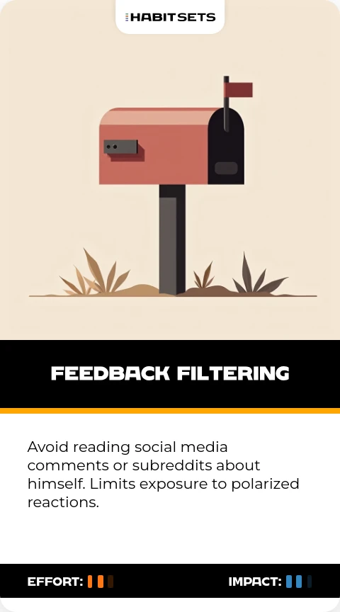 Avoid reading social media comments or subreddits about himself. Limits exposure to polarized reactions.