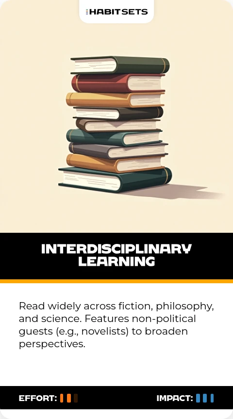 Read widely across fiction, philosophy, and science. Features non-political guests (e.g., novelists) to broaden perspectives.