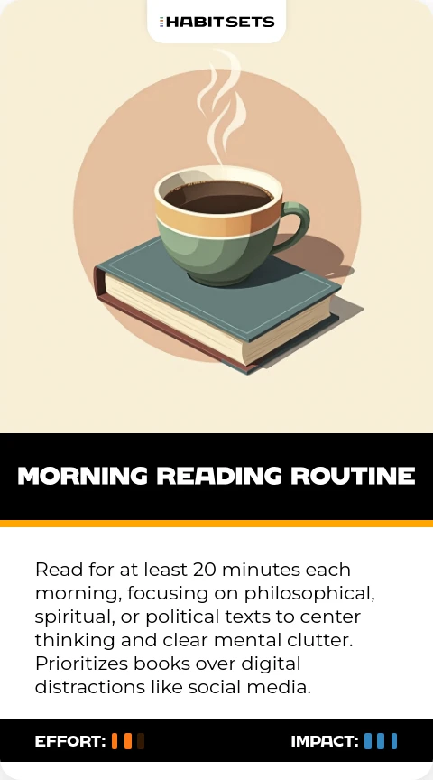 Read for at least 20 minutes each morning, focusing on philosophical, spiritual, or political texts to center thinking and clear mental clutter. Prioritizes books over digital distractions like social media.