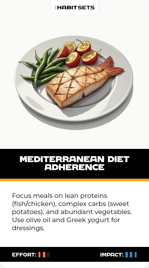 Focus meals on lean proteins (fish/chicken), complex carbs (sweet potatoes), and abundant vegetables. Use olive oil and Greek yogurt for dressings.