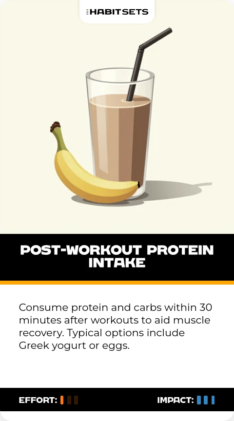 Consume protein and carbs within 30 minutes after workouts to aid muscle recovery. Typical options include Greek yogurt or eggs.
