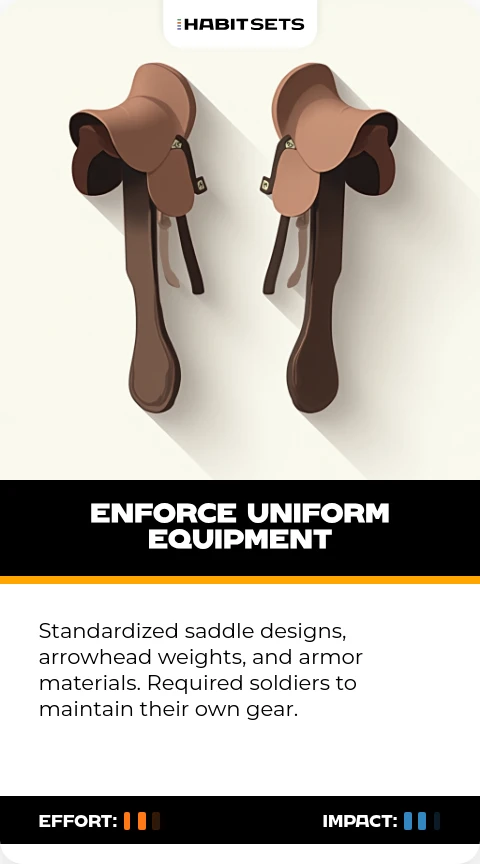 Standardized saddle designs, arrowhead weights, and armor materials. Required soldiers to maintain their own gear.