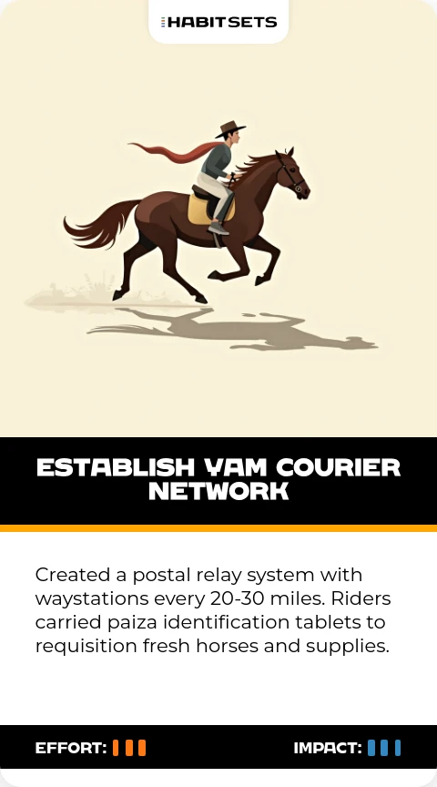 Created a postal relay system with waystations every 20-30 miles. Riders carried paiza identification tablets to requisition fresh horses and supplies.