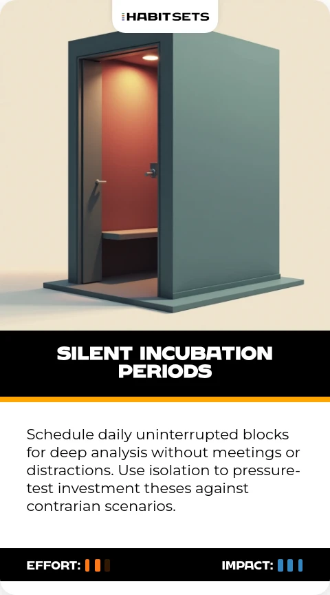 Schedule daily uninterrupted blocks for deep analysis without meetings or distractions. Use isolation to pressure-test investment theses against contrarian scenarios.