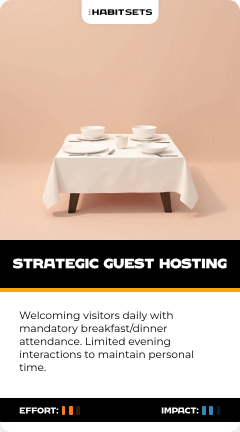 Enforcing strict dining schedules (7 AM breakfast, 3 PM dinner) with bell signals. Meals emphasized conversation over indulgence, often accompanied by political discussions.