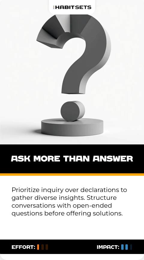 Prioritize inquiry over declarations to gather diverse insights. Structure conversations with open-ended questions before offering solutions.