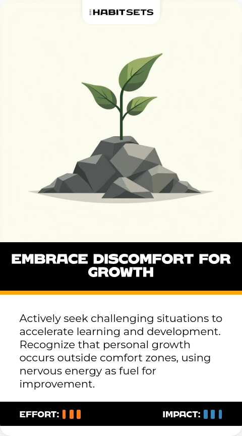 Actively seek challenging situations to accelerate learning and development. Recognize that personal growth occurs outside comfort zones, using nervous energy as fuel for improvement.