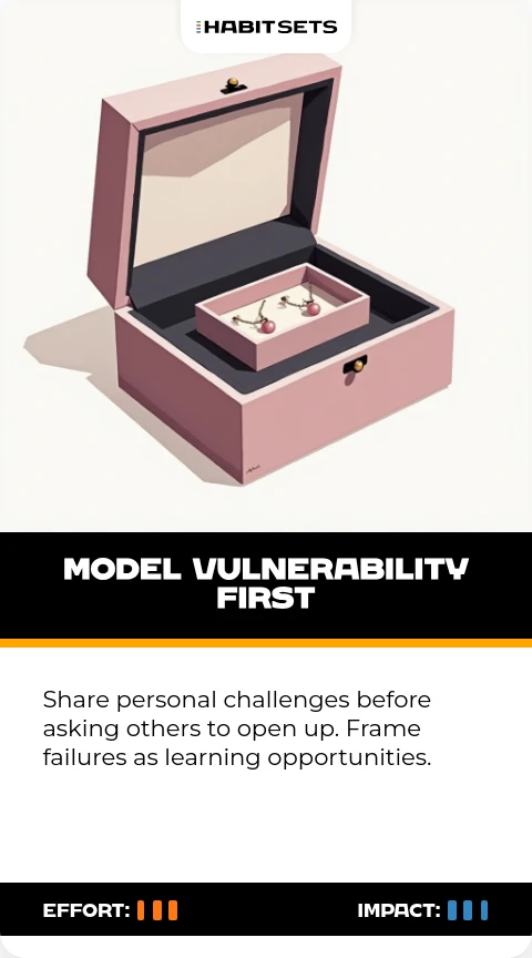 Share personal challenges before asking others to open up. Frame failures as learning opportunities.