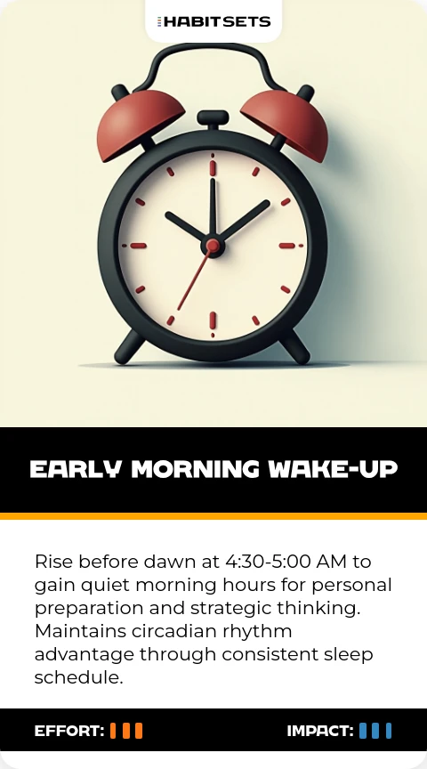 Rise before dawn at 4:30-5:00 AM to gain quiet morning hours for personal preparation and strategic thinking. Maintains circadian rhythm advantage through consistent sleep schedule.