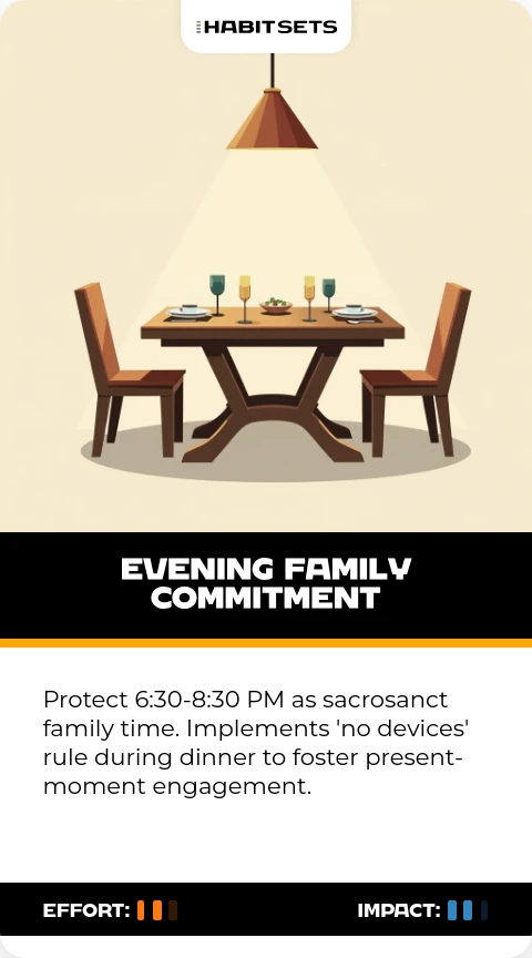 Protect 6:30-8:30 PM as sacrosanct family time. Implements 'no devices' rule during dinner to foster present-moment engagement.