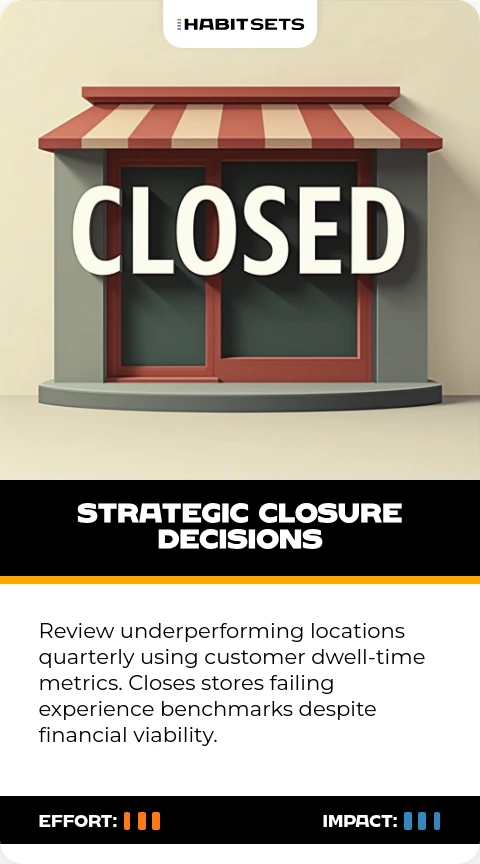 Review underperforming locations quarterly using customer dwell-time metrics. Closes stores failing experience benchmarks despite financial viability.