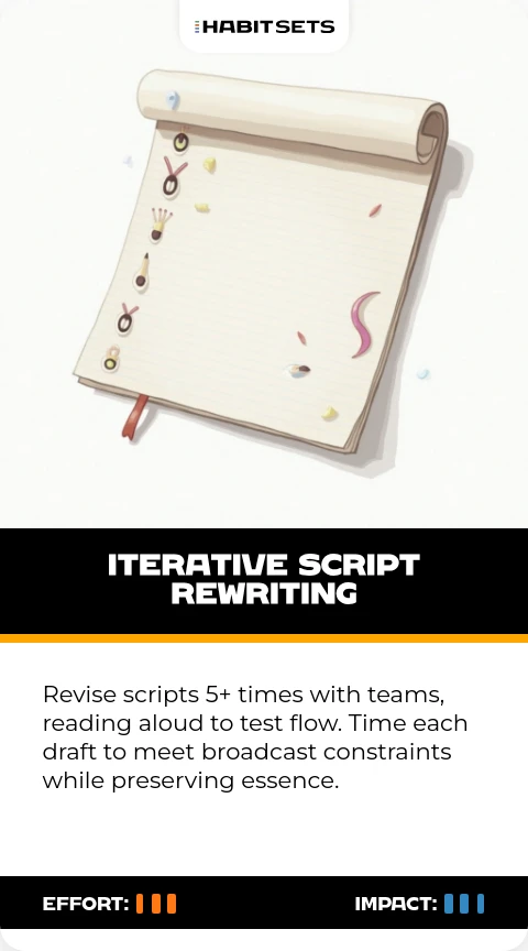 Revise scripts 5+ times with teams, reading aloud to test flow. Time each draft to meet broadcast constraints while preserving essence.